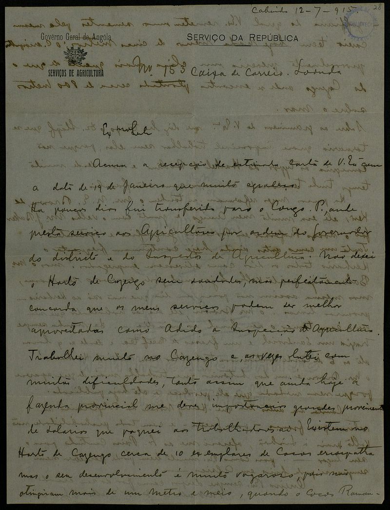 Papel timbrado de: Govêrno Geral de Angóla - Serviços de Agricultura.