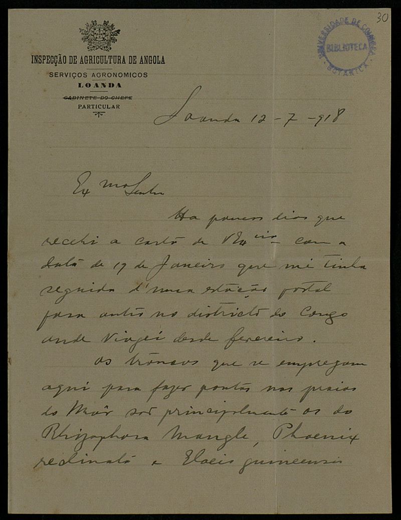 [Carta], 1918 Jul. 12, Loanda, [a Júlio Henriques, Coimbra]