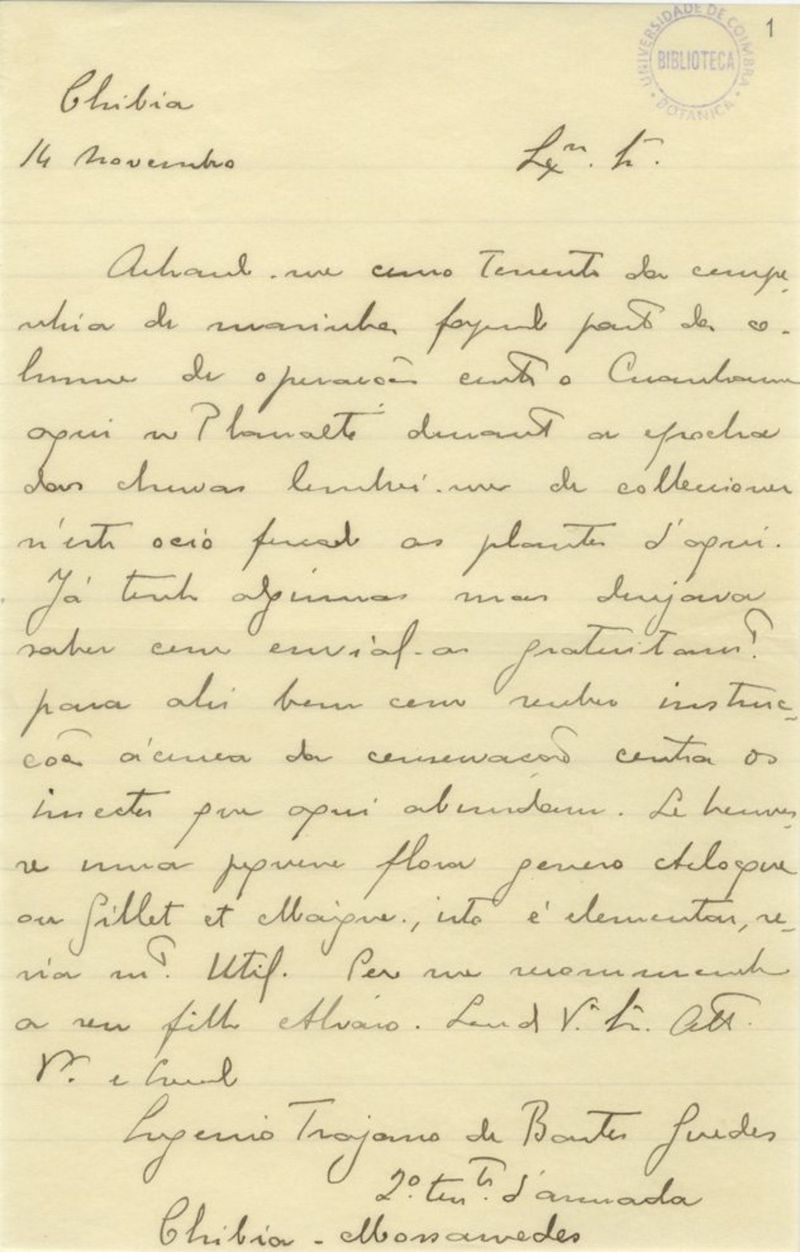 [Carta], [19--?] Nov. 14, Chibia, Mossamedes, [a Júlio Henriques, Coimbra] Eugenio Trajano de Bastos Guedes