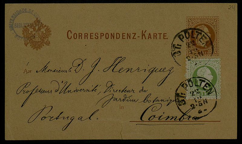Correspondenz-Karte, 1882 déc. 22, St. Poelten, [à] D. J. Henriquez, Coimbra