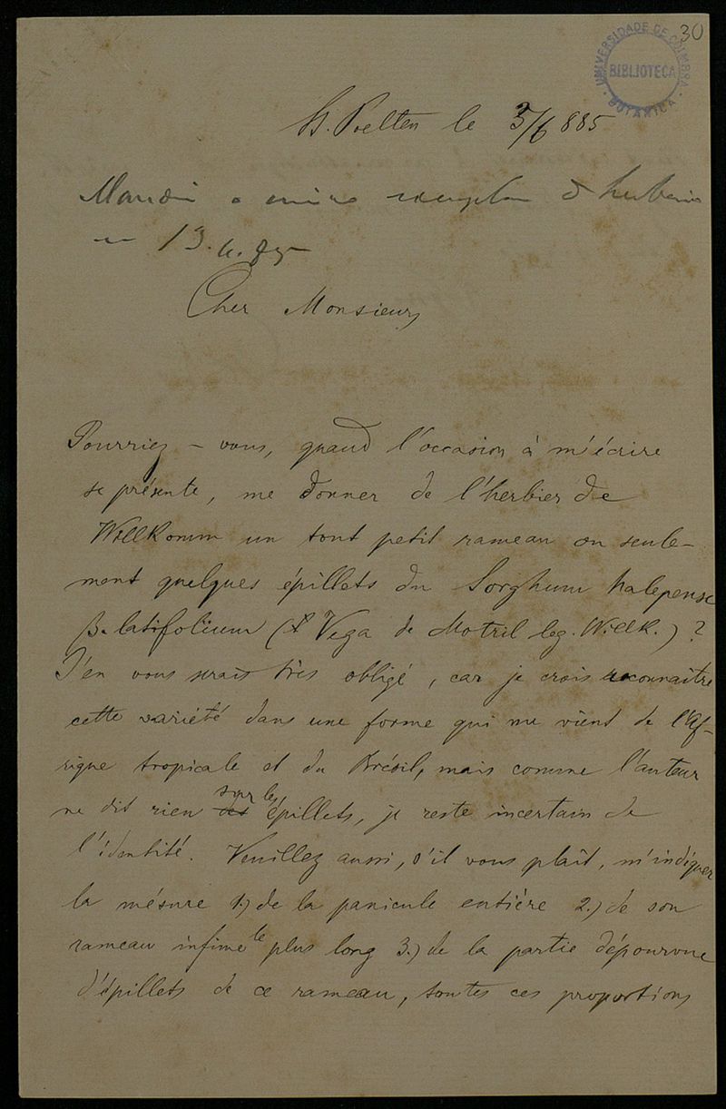 [Lettre], 1885 juin 3, St. Poelten, [à] Monsieur [Júlio Henriques], Coimbra