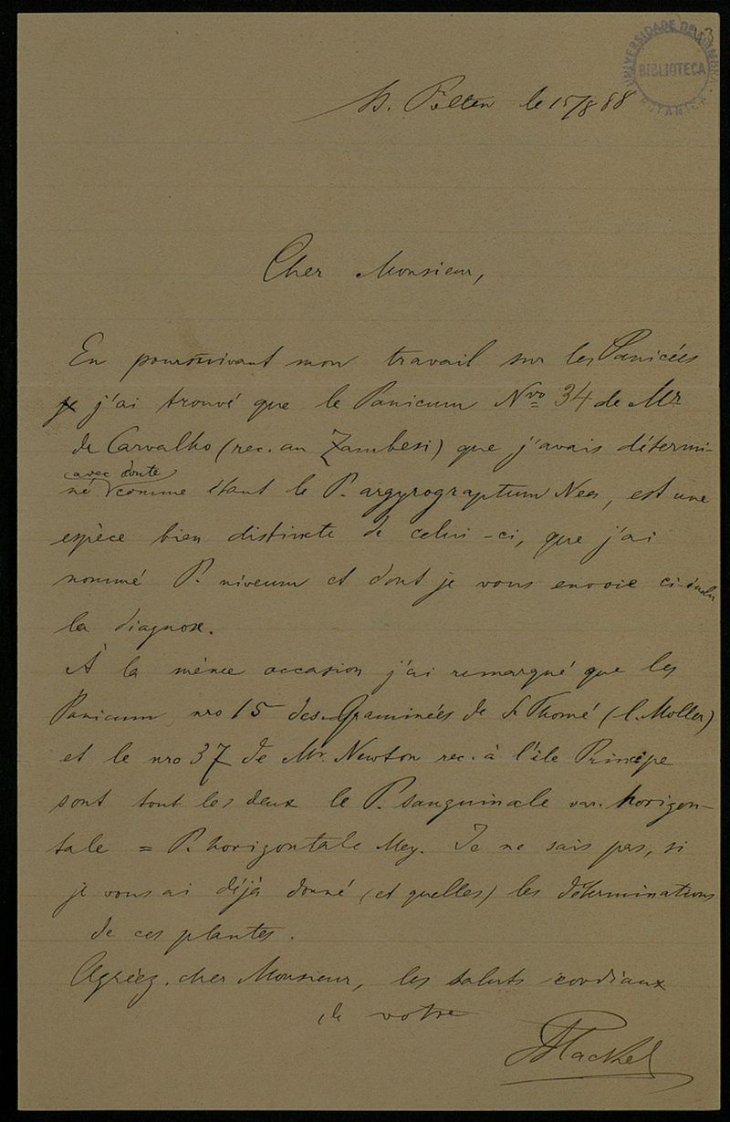 [Lettre], 1888 août 15, St. Poelten, [à] Monsieur [Júlio Henriques], Coimbra
