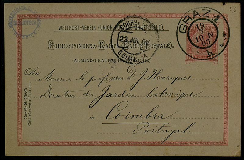 Correspondenz-Karte, 1905 juil. 19, Graz, [à] Monsieur le D. J. Henriques, Coimbra