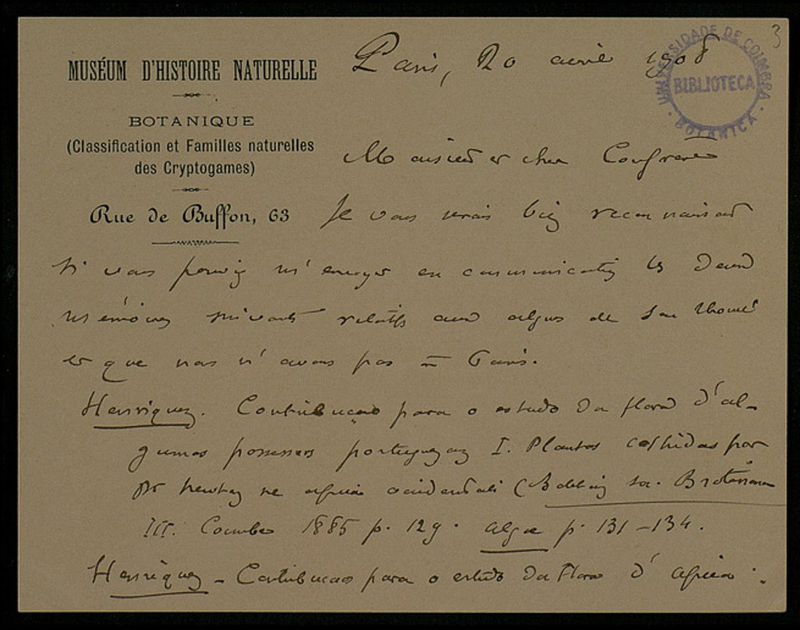 Papel timbrado de: Musèum d'Histoire Naturelle-Laboratoire de Cryptogamie.