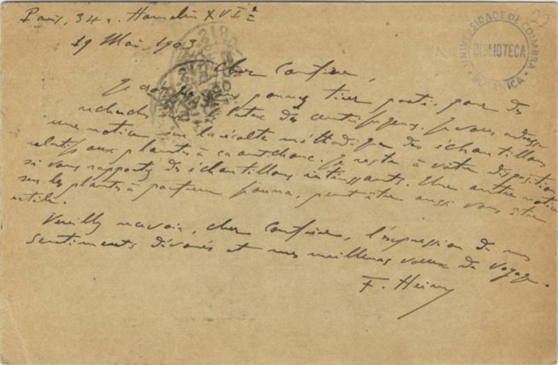 [Carte postale], 1903 mai 19, Paris, [à Júlio] Henriques, Coimbra