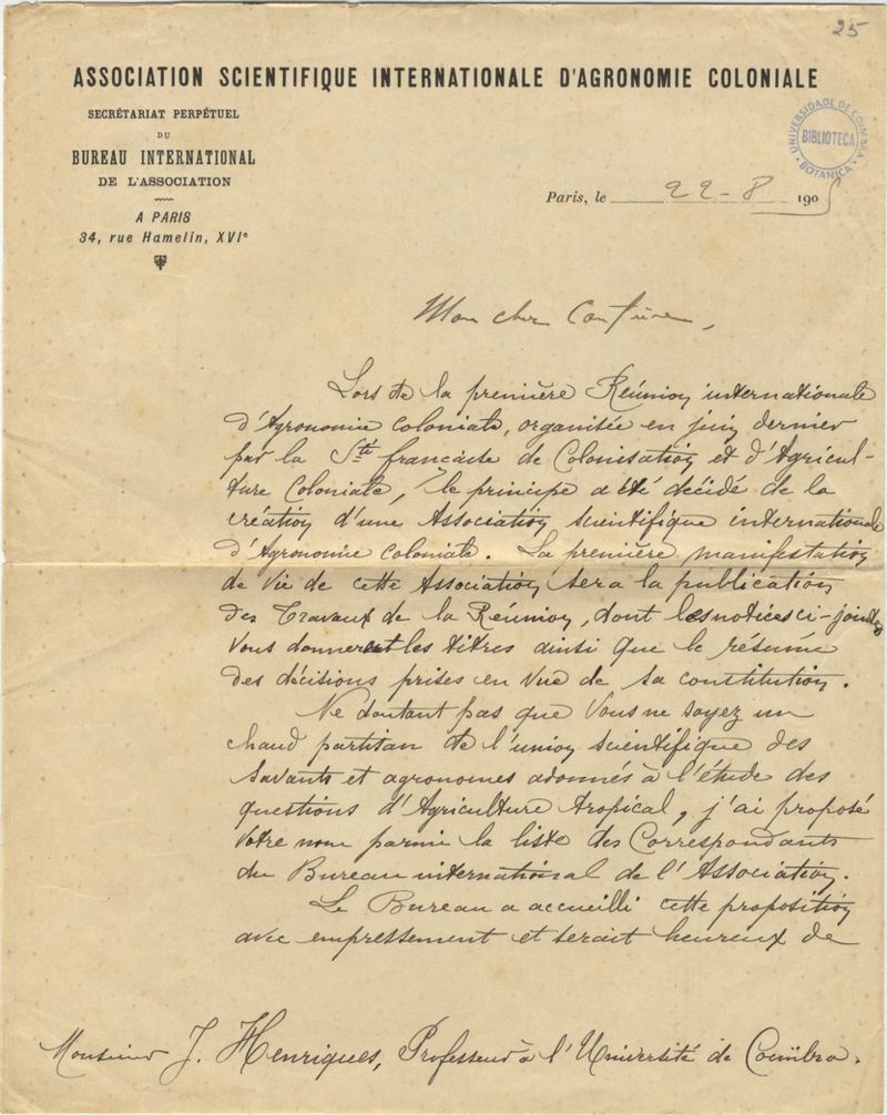 Em papel timbrado de "Association Scientifique Internationale d'Agronomie Coloniale - Secrétariat Perpétuel du Bureau International de l'Association".