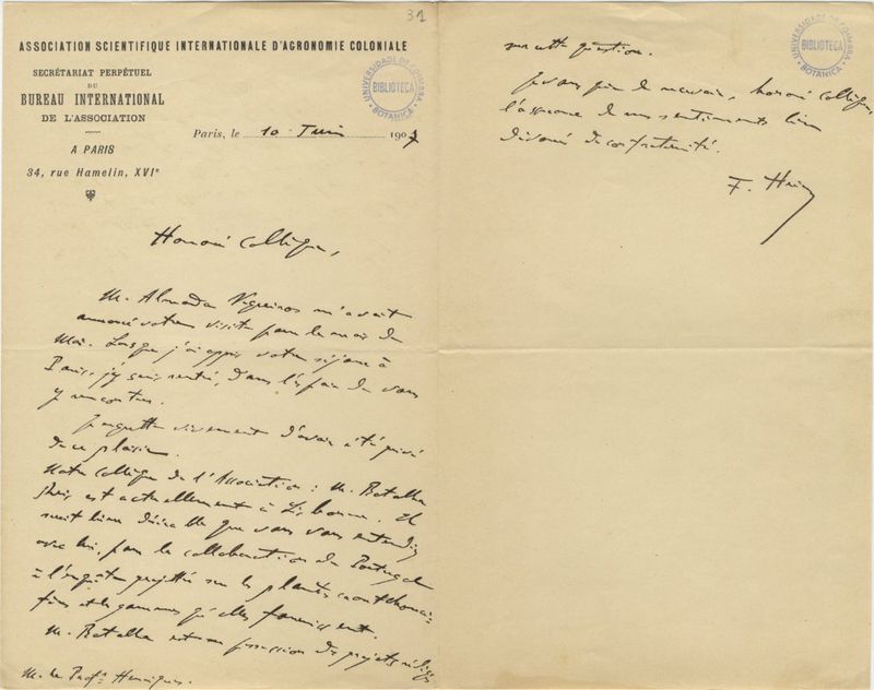 [Lettre], 1907 juin 10, Paris, [à Júlio] Henriques, [Coimbra]