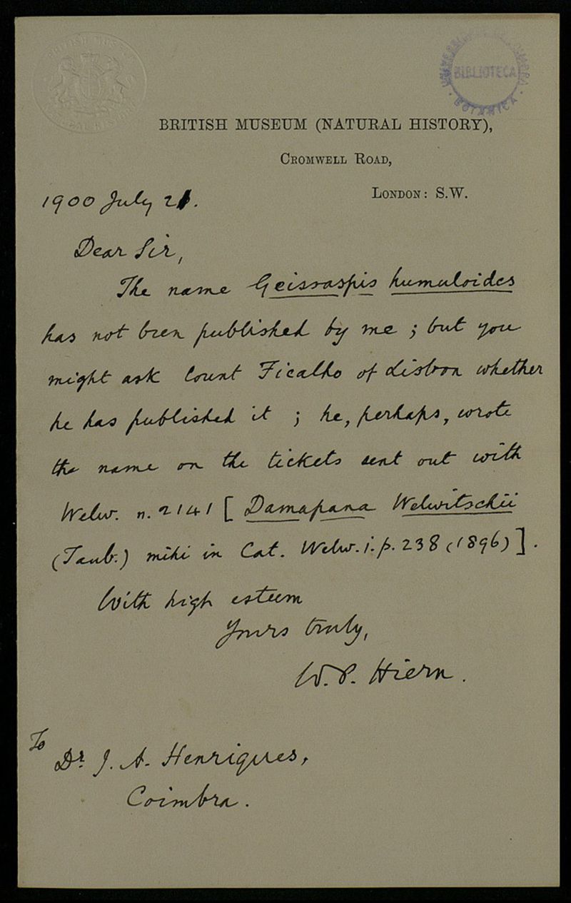 [Letter], 1900 July 2, London, [to] Dr. J. A. Henriques, Coimbra