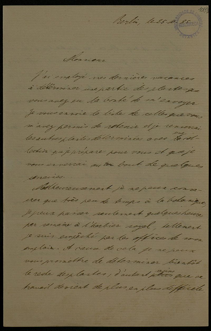 [Lettre], 1885 oct. 25, Berlin, [à] Monsieur [Júlio Henriques], Coimbra