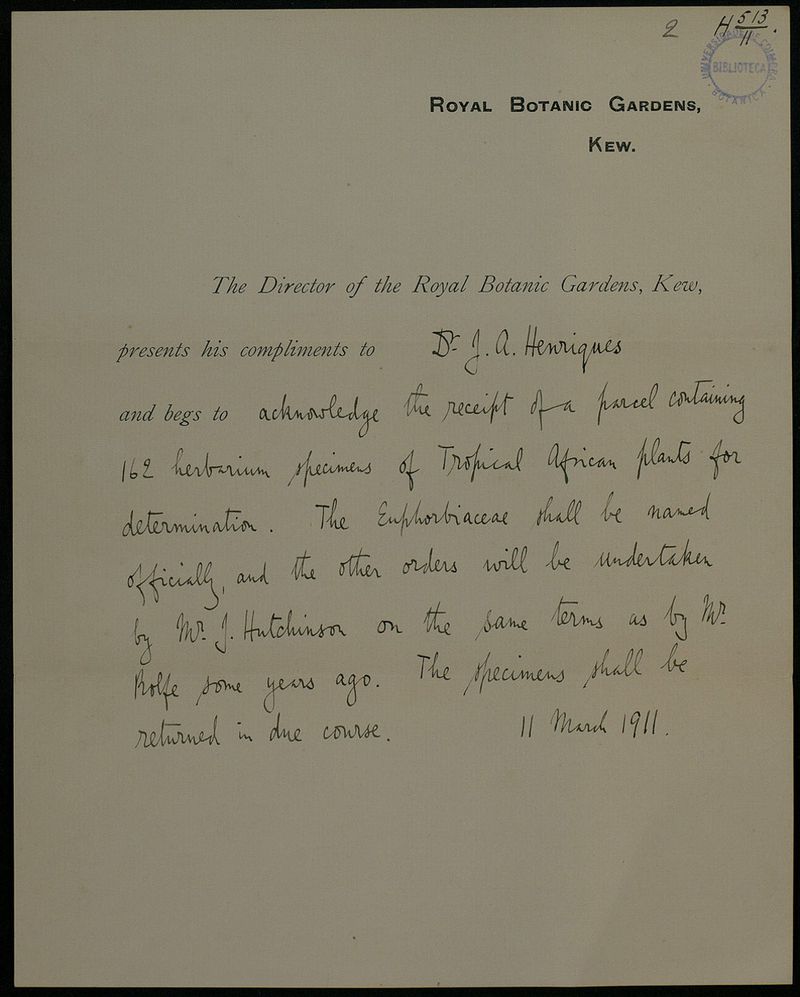 [Letter], 1911 Mar. 11, Kew, [to] Dr. J. A. Henriques, Coimbra