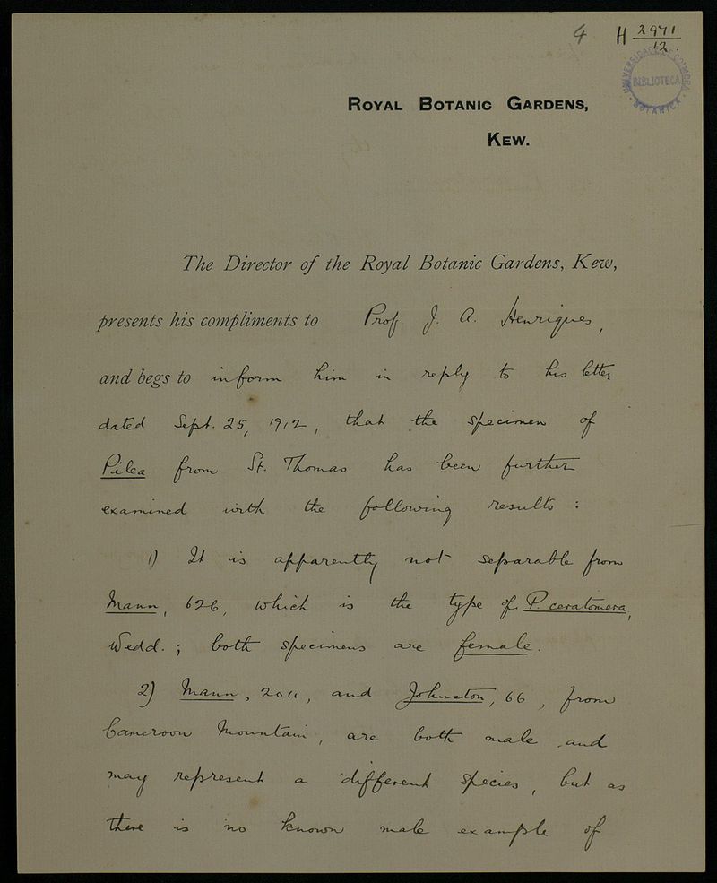 [Letter], 1912 Oct. 3, Kew, [to] Prof. J. A. Henriques, Coimbra