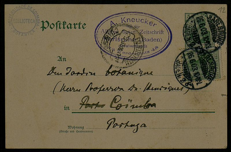 Postkarte, 1903 Juni 26, Karlsruhe, an Herrn Professor Dr. [Júlio] Henriques, Coimbra