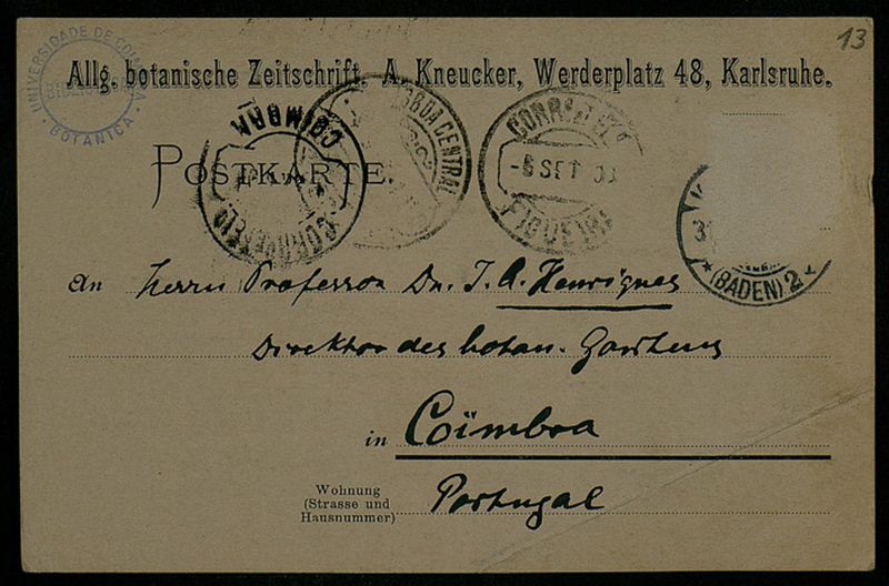 Postkarte, 1903 Aug. 31, Karlsruhe, an Herrn Professor Dr. J. A. Henriques, Coimbra