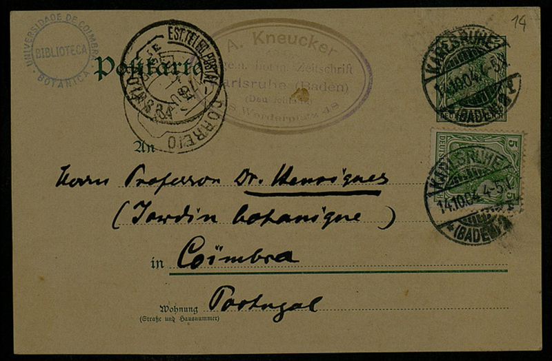 Postkarte, 1904 Okt. 14, Karlsruhe, an Herrn Professor Dr. [Júlio] Henriques, Coimbra