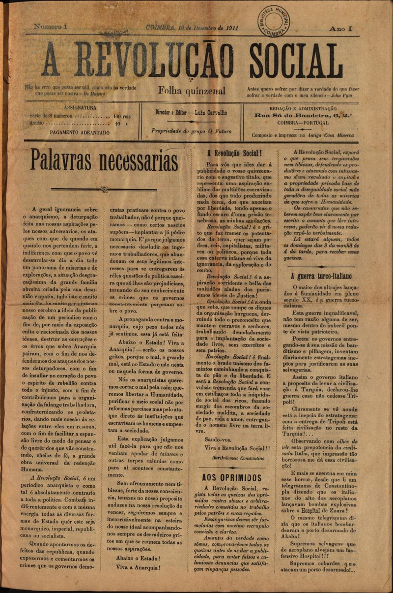 A revolução social : folha quinzenal – Nº1