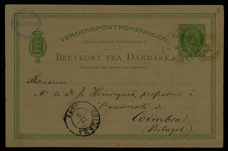 Verdenspostforeningen, 1881 août 18, Copenhague, [à] Monsieur Dr. J. Henriques, Coimbra