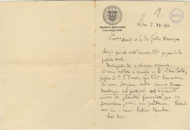 [Carta], 1912 Nov. 02, Lisboa, [a] Júlio Henriques, [Coimbra]