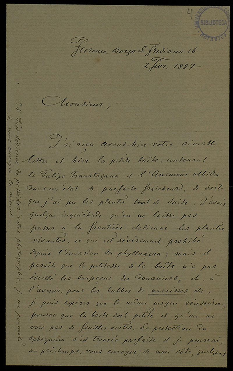 [Lettre], 1887 fév. 2, Florence, à Monsieur [Júlio Henriques, Coimbra]