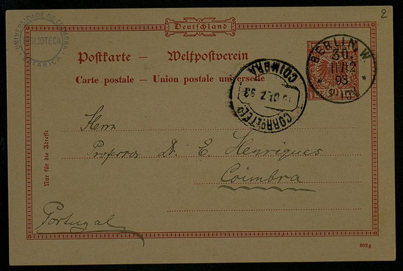 Postkarte, 1893 Dez. 11, Berlin, [an] Herrn Professor Dr. J. Henriques, Coimbra