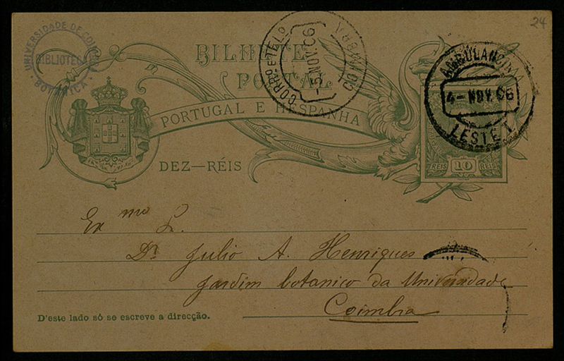Bilhete Postal, 1906 Nov. 3, Lisboa, a Dr. Júlio A. Henriques, Coimbra