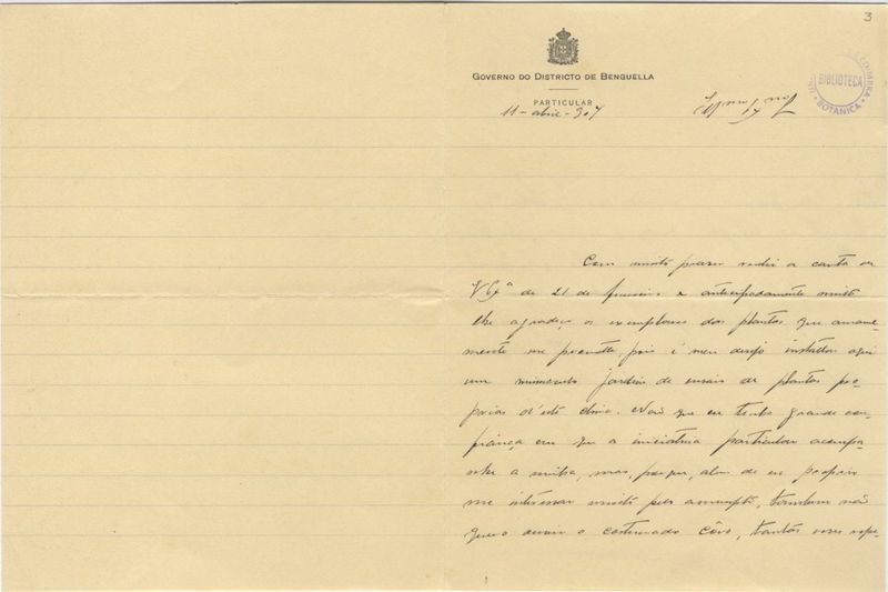 Em papel com ex-libris e timbre de "Governo do Districto de Benguella - Particular".