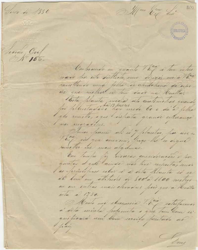Em papel com selo branco de "Governo do Districto de Mossamedes"; "Serie de 1884 - Secção Civil Nº 166".
