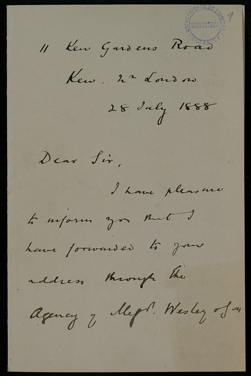 [Letter], 1888 July 28, London, [to] Professor J. A. Henriques, Coimbra