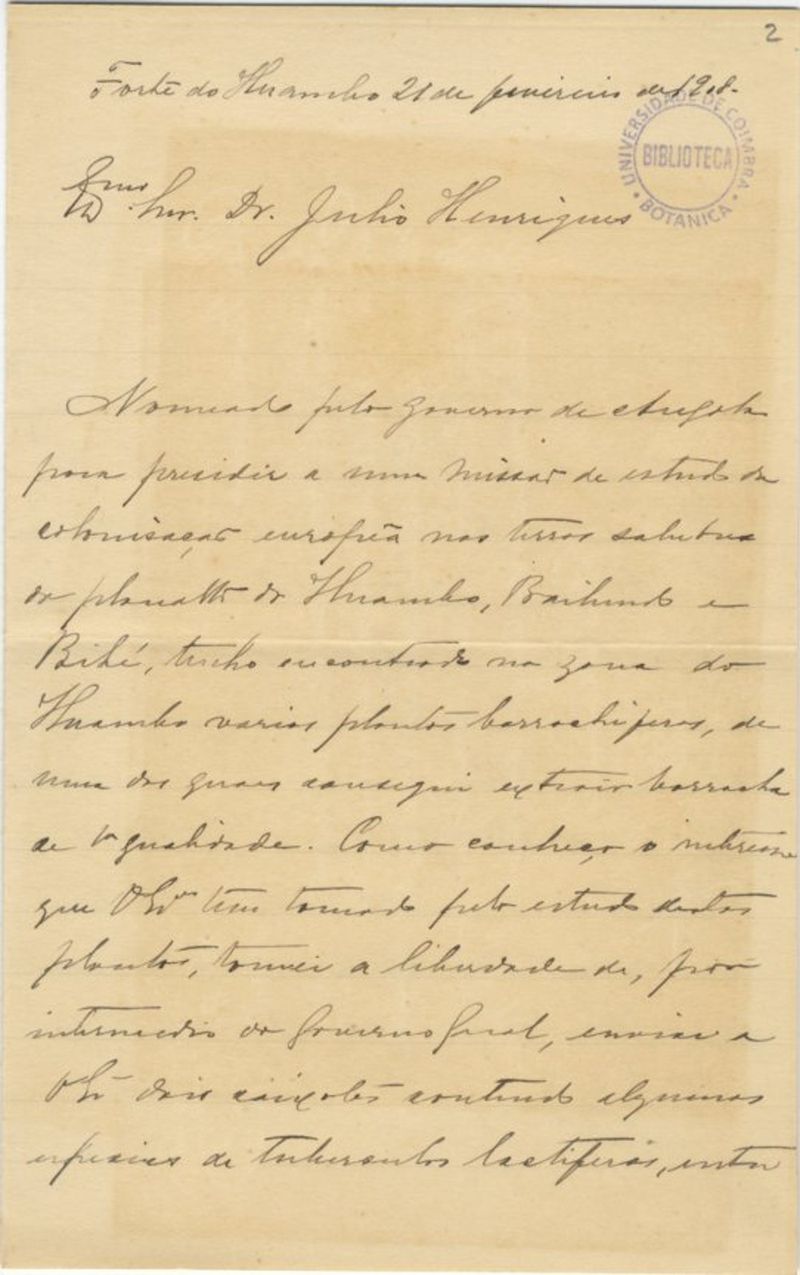 [Carta], 1908 Fev.,21 Forte do Huambo, [a] Júlio Henriques, [Coimbra]
