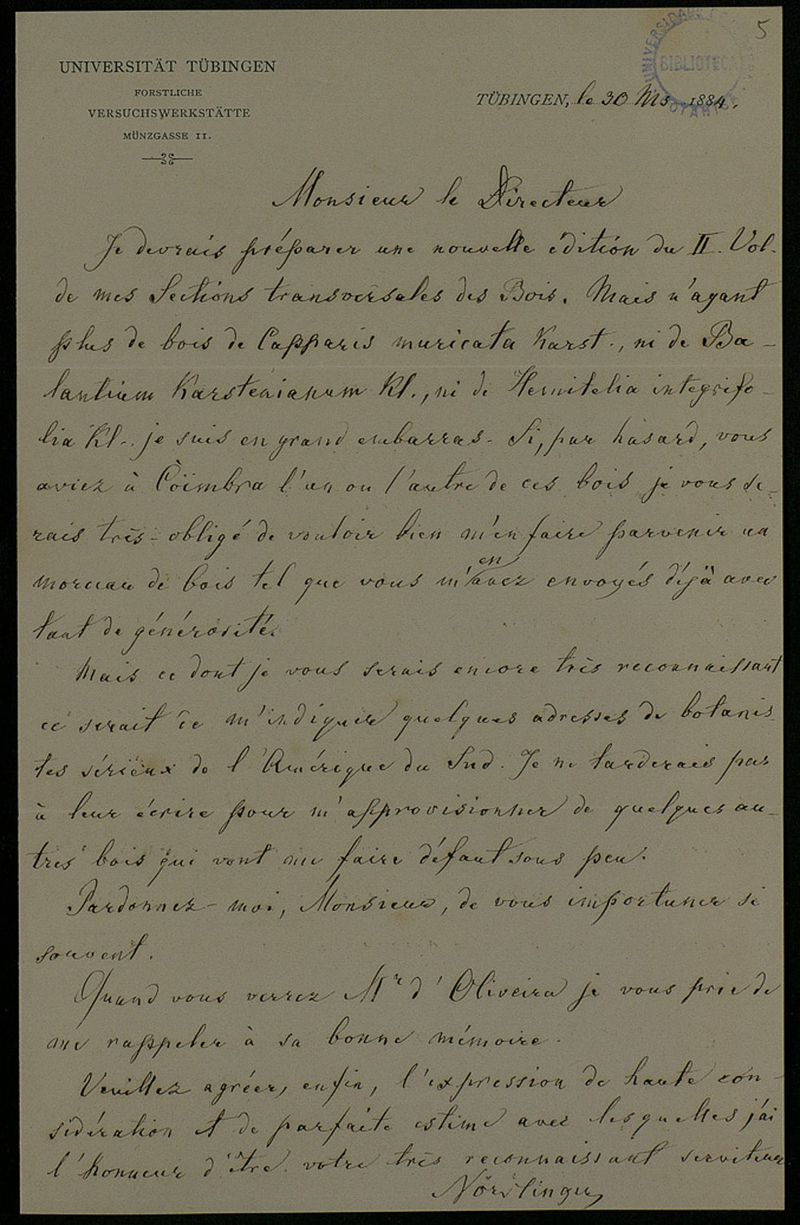 [Lettre], 1884 mars 30, Tubingen, [à] Monsieur [Júlio Henriques], Coimbra
