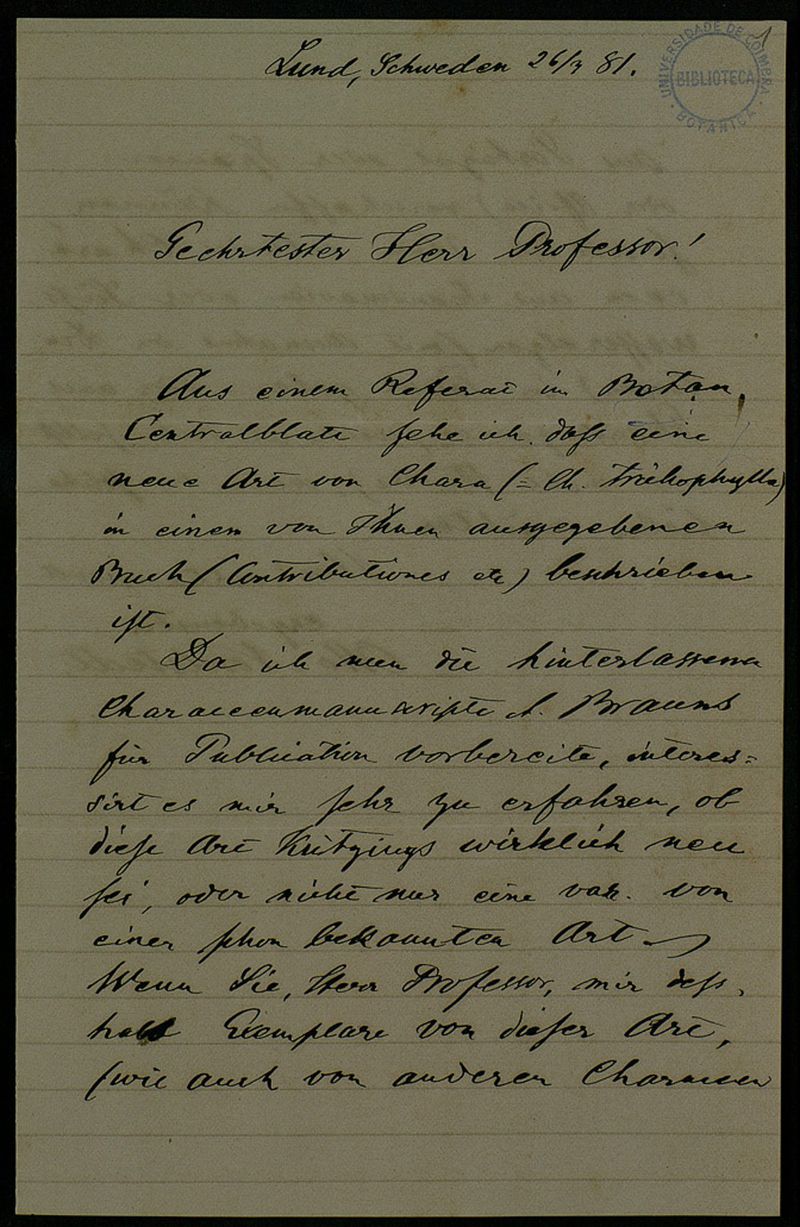 [Brief], 1881 März 26, Lund, [an] Herr[n] Professor [Júlio Henriques, Coimbra]