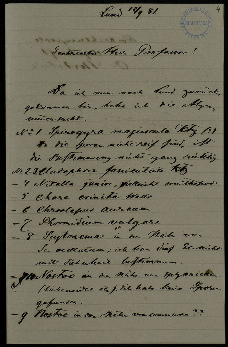 [Brief], 1881 Sept. 12, Lund, [an] Herr[n] Professor [Júlio Henriques, Coimbra]