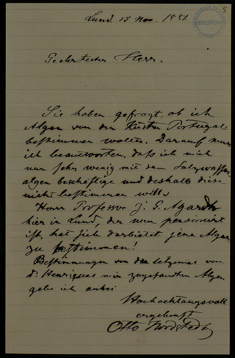 [Brief], 1881 Nov. 15, Lund, [an] Herr[n Júlio Henriques, Coimbra]