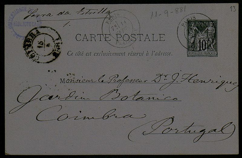 Carte postale, 1881 sept. 11, Paris, [à] Monsieur le Professeur Dr. J. Henriques, Coimbra