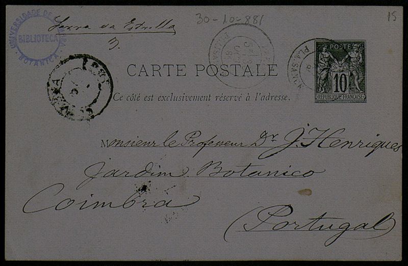 Carte postale, 1881 oct. 30, Paris, [à] Monsieur le Professeur Dr. J. Henriques, Coimbra