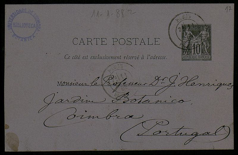 Carte postale, 1882 jan. 11, Paris, [à] Monsieur le Professeur Dr. J. Henriques, Coimbra