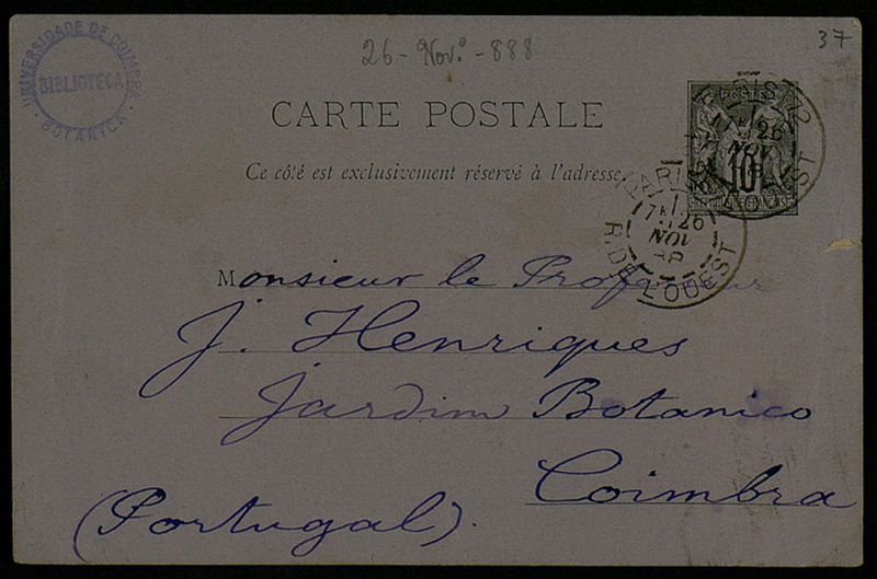 Carte postale, 1888 nov. 26, Paris, [à] Monsieur le Professeur J. Henriques, Coimbra
