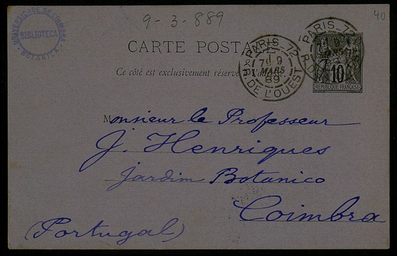 Carte postale, 1889 mars 9, Paris, [à] Monsieur le Professeur J. Henriques, Coimbra