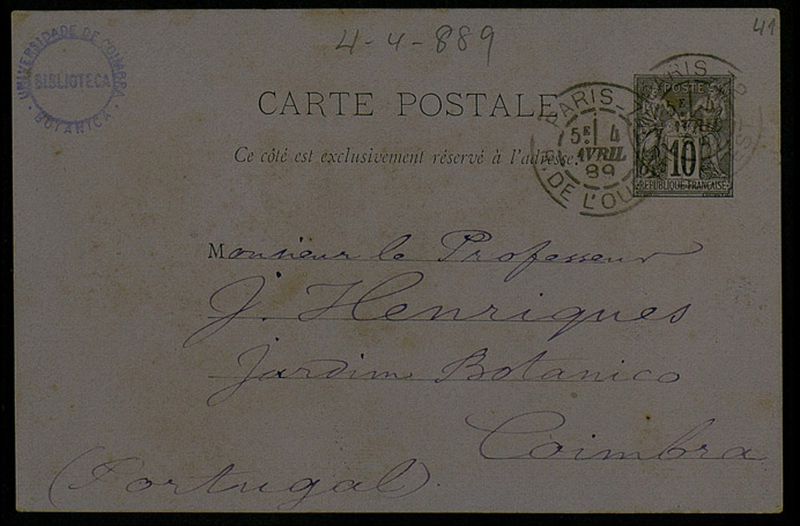 Carte postale, 1889 avr. 4, Paris, [à] Monsieur le Professeur J. Henriques, Coimbra