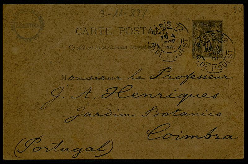 Carte postale, 1891 nov. 3, Paris, [à] Monsieur le Professeur J. Henriques, Coimbra