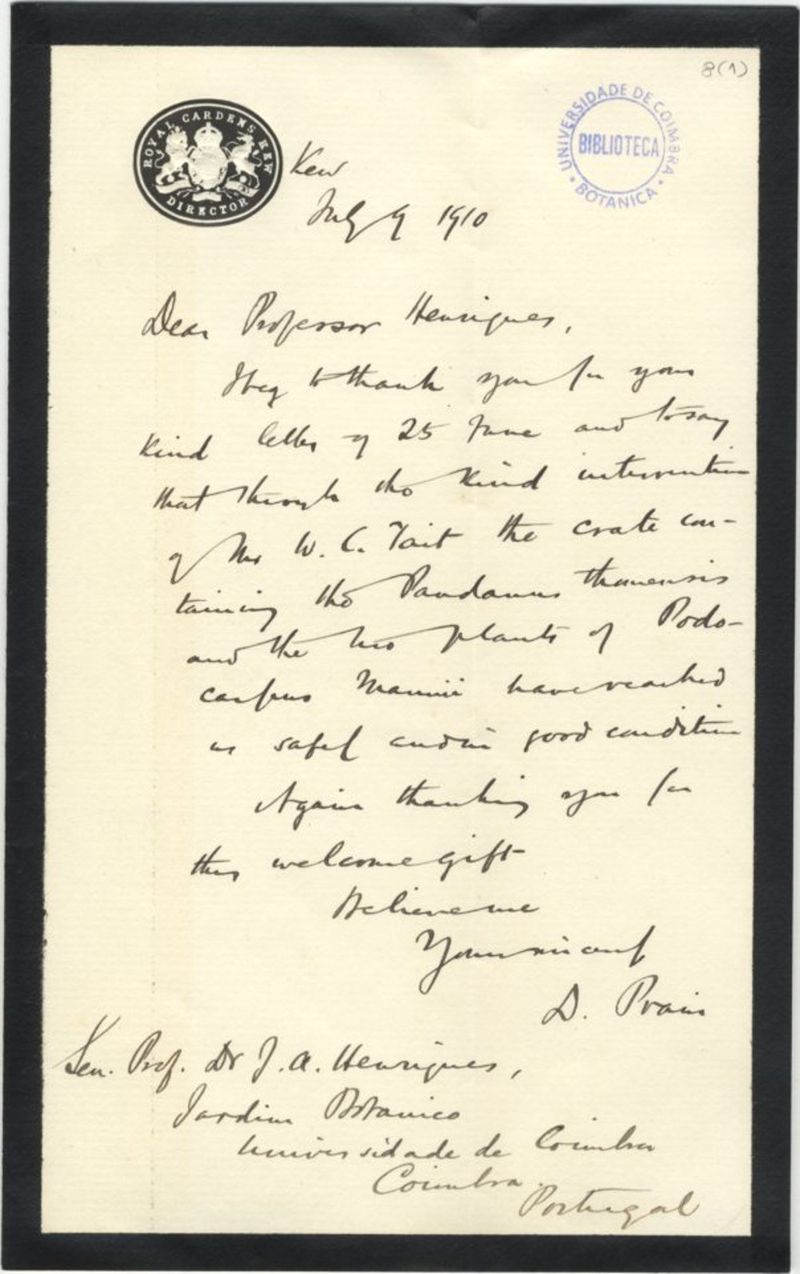 [Letter], 1910 July 09, Kew, [to] J[úlio] A[ugusto] Henriques, Coimbra