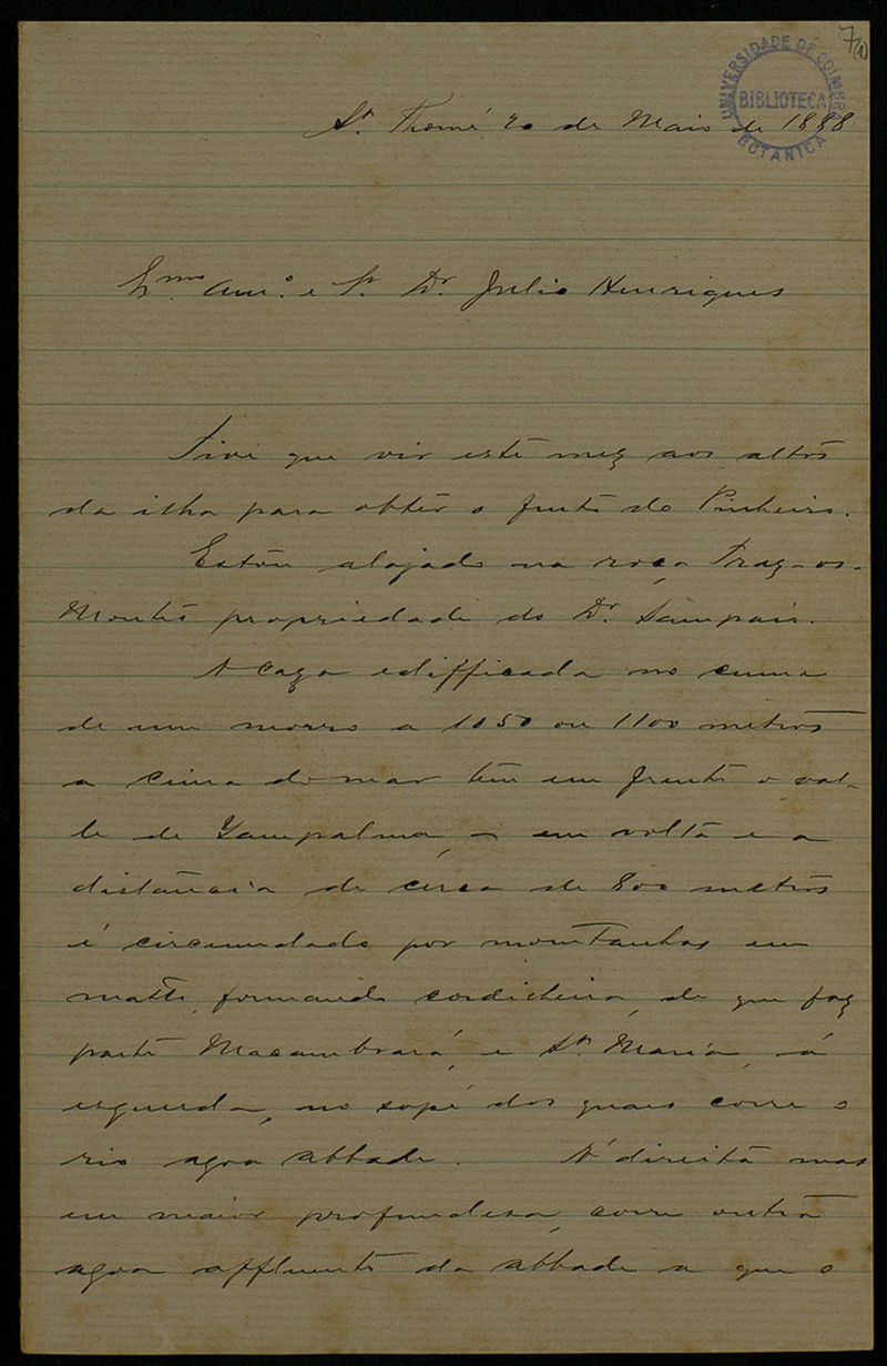 [Carta], 1888 Maio 20, S. Thomé, [a] Dr. Julio Henriques, Coimbra