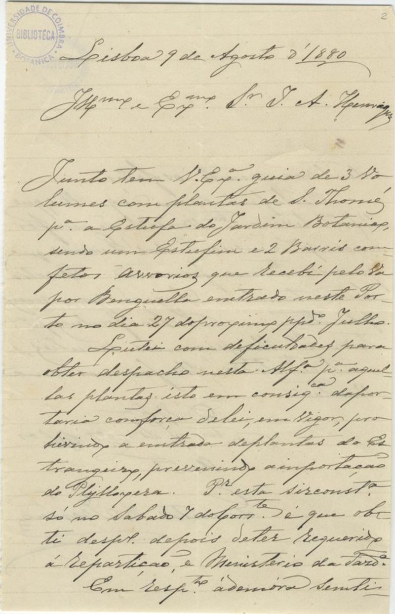 [Carta], 1880 Ago. 09, Lisboa, [a] J[úlio] A[ugusto] Henriques, [Coimbra]