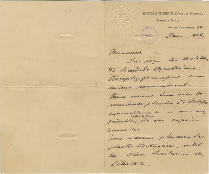 [Lettre], 1886 jan., [London, à Júlio Henriques, Coimbra]