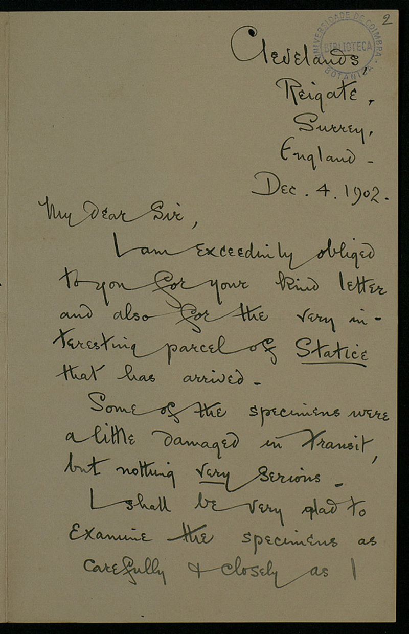 [Letter], 1902 Dec. 4, Reigate, [to] Sir [Júlio Henriques, Coimbra]