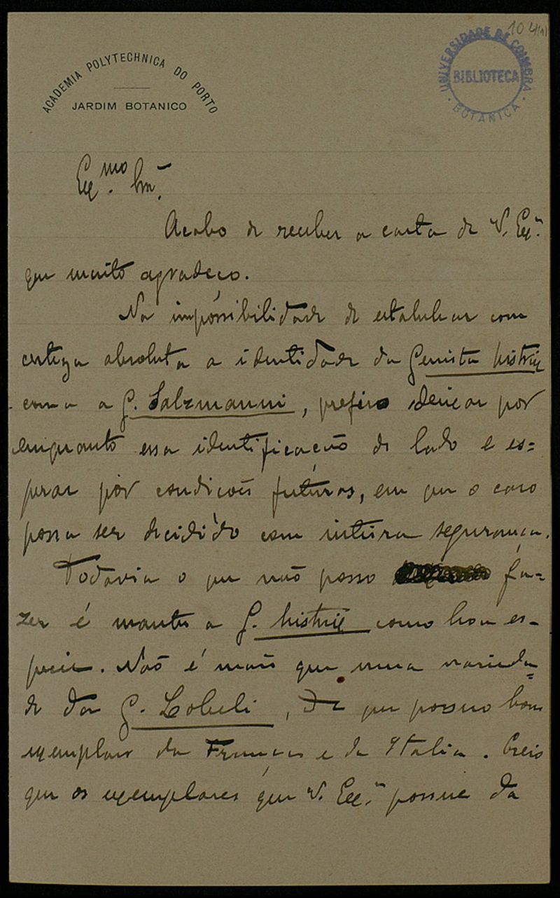Papel timbrado de: Academia Polythechnica do Porto - Jardim Botanico.
