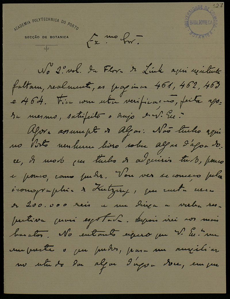 Papel timbrado de: Academia Polythechnica do Porto - Secção de Botanica.