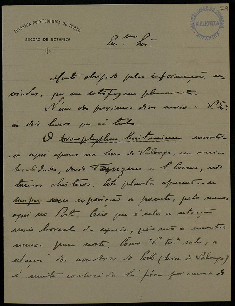 Papel timbrado de: Academia Polythechnica do Porto - Secção de Botanica.