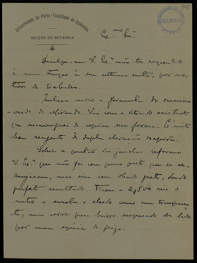 Papel timbrado de: Universidade do Pôrto - Faculdade de Sciências - Secção de Botanica.