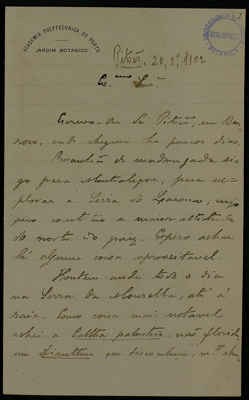 Papel timbrado de: Academia Polythechnica do Porto - Jardim Botanico.