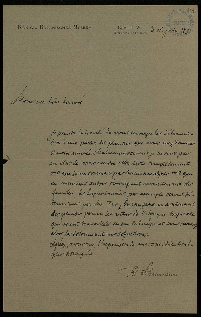 [Lettre], 1891 juin 15, Berlin, [à] Monsieur [Júlio Henriques], Coimbra